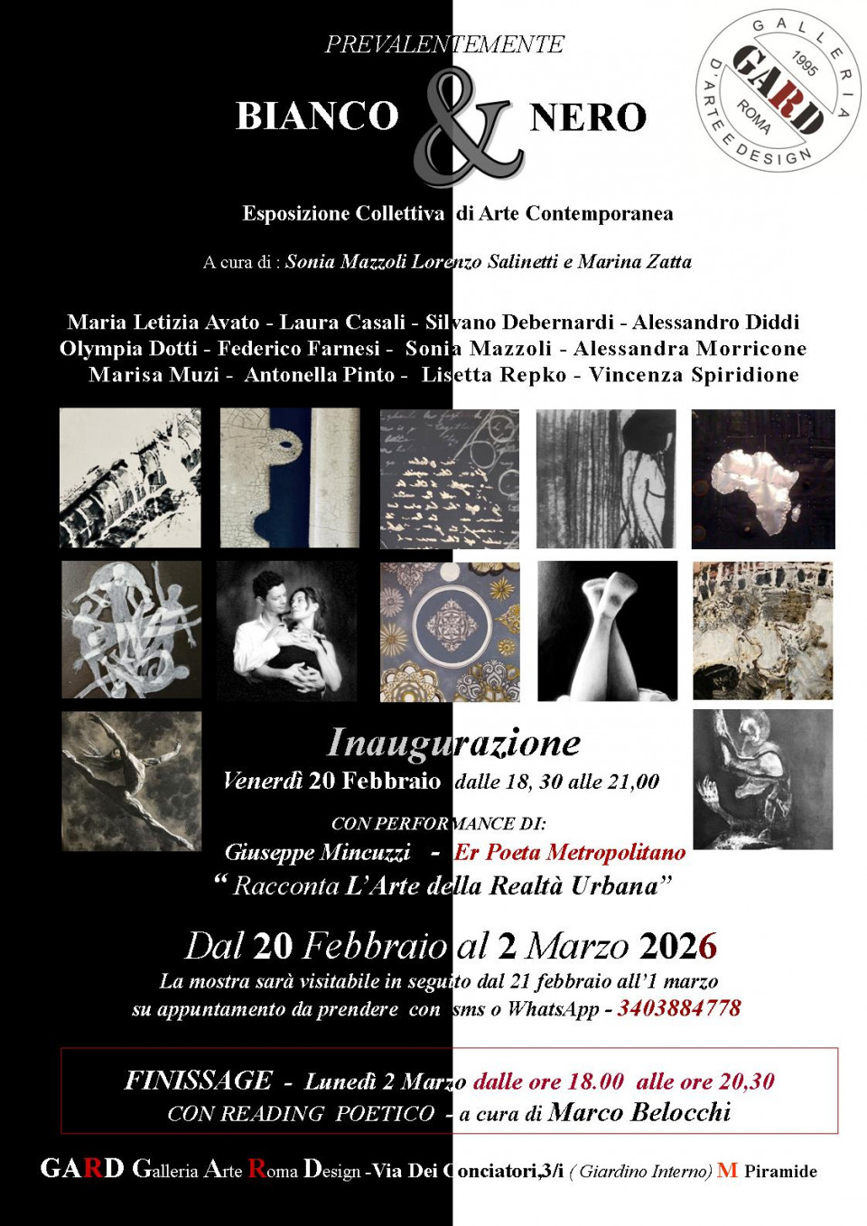 Prevalentemente Bianco & Nero Esposizione di Arte Contemporanea ARTISTI: Maria Letizia Avato - Laura Casali - Silvano Debernardi - Alessandro Diddi - Olympia Dotti Federico Farnesi - Sonia Mazzoli - Giuseppe Mincuzzi - Alessandra Morricone - Marisa Muzi - Antonella Pinto - Lisetta Repko - Vincenza Spiridione. A CURA DI: Sonia Mazzoli , Lorenzo Salinetti Staff: Matteo Appetito - Samuele De Marchi - Filippo Vitale. La Galleria GARD presenta da venerdì 20 febbraio 2026, una nuova edizione della mostra denominata “Prevalentemente BIANCO & NERO”, esposizione collettiva di Arte Contemporanea, Tredici sono gli artisti selezionati per questa...